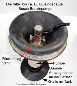 Bis ca. Ende Baujahr 1988 wurde die relativ robuste Bosch-Ausführung eingebaut, die ganz selten kaputtgeht, ausser sie saugt im Tank befindlichen Schmutz an und zerstört ihr empfindliches Schleuderring-Fliehkraftinnenleben selbst !