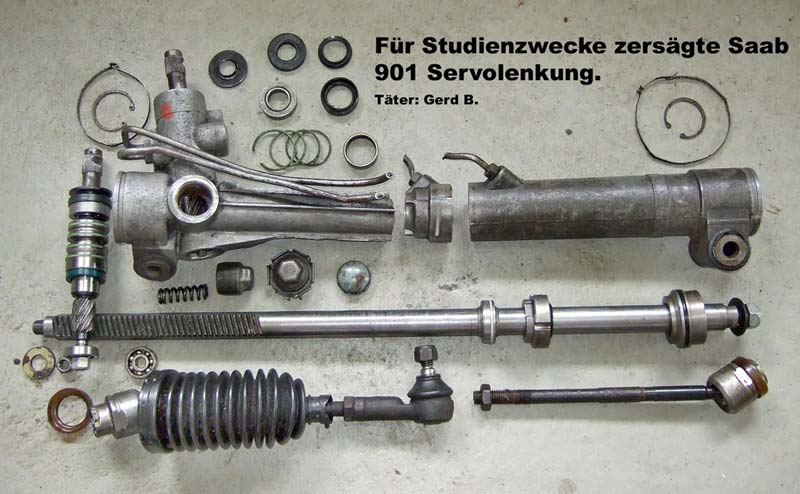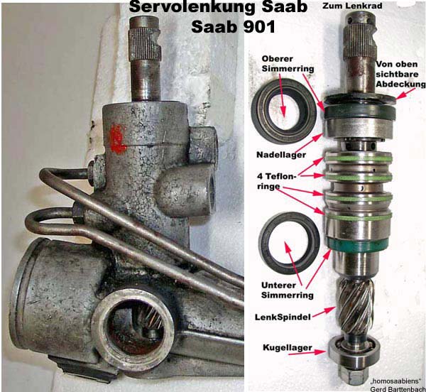 Durch Rechts-Links-Lenkradbewegung öffnen sich durch Verdrehen Schlitze, (weit, oder je nach Hilfskrafterfordernis weniger weit), welche die unter Druck stehende Servolenkflüssigkeit (ATF 3, oder org. Saabflüssigkeit, je nach Religion *g*) in eine der seitlichen Kammern zwischen den zwei äusseren Teflonringen und von dort weiter über enstprechende Rohre im Steuerzylinder vor den Betätigungs-Kolben der Servolenkung strömen lassen.