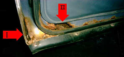 wütet. Rost kann den Innenrahmen der Tür betreffen (im Bild Nr. II) sowie den